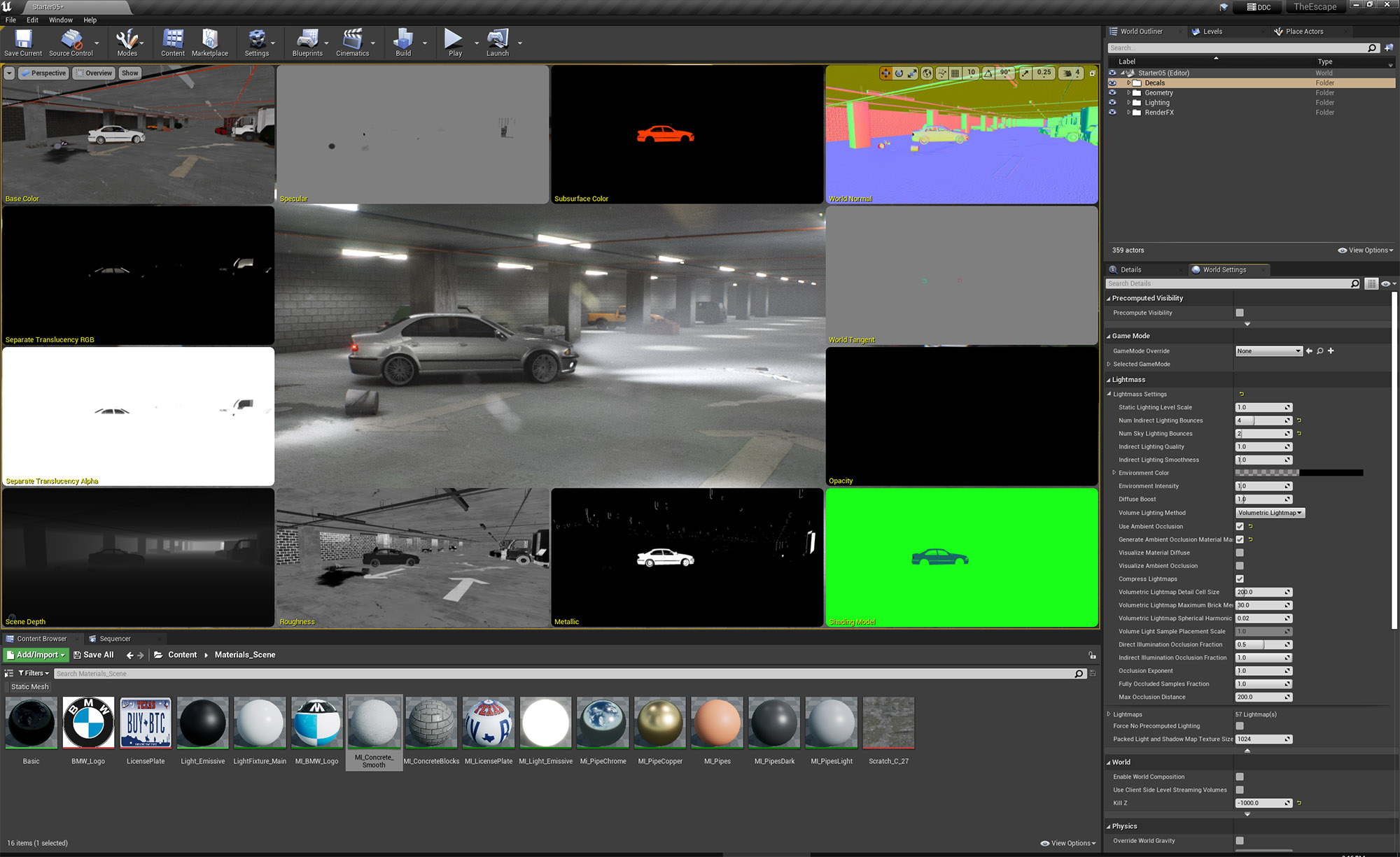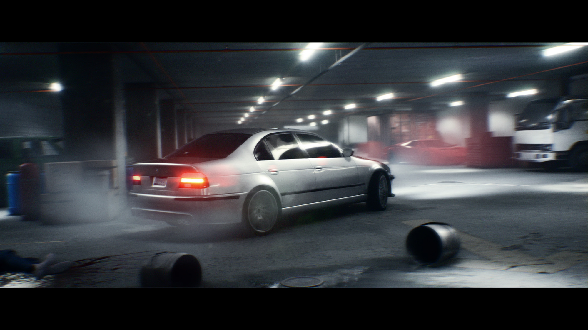 The BMW car model was completed by myself using blueprint and photo references. The main garage geo was modeled using